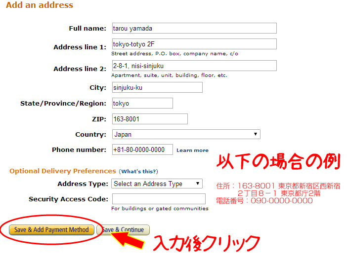 発送先の氏名・住所・電話番号を入力後、「Save & Payment Method」ボタンをクリック
